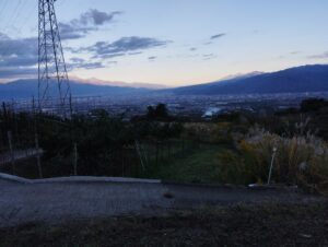 まだ暗い盆地の空が、ふたを開けるように明るくなってくる。この感じだ。これは他にはない空間になる。徐々に南アルプスのほうに、大体は甲斐駒のとがった三角が明るくなる。まだ雪はない。空は茜色。今日一日の幕開け。昔は盆地の底は真っ暗だった。夜明けでも甲府盆地はすでに動き始めていた。