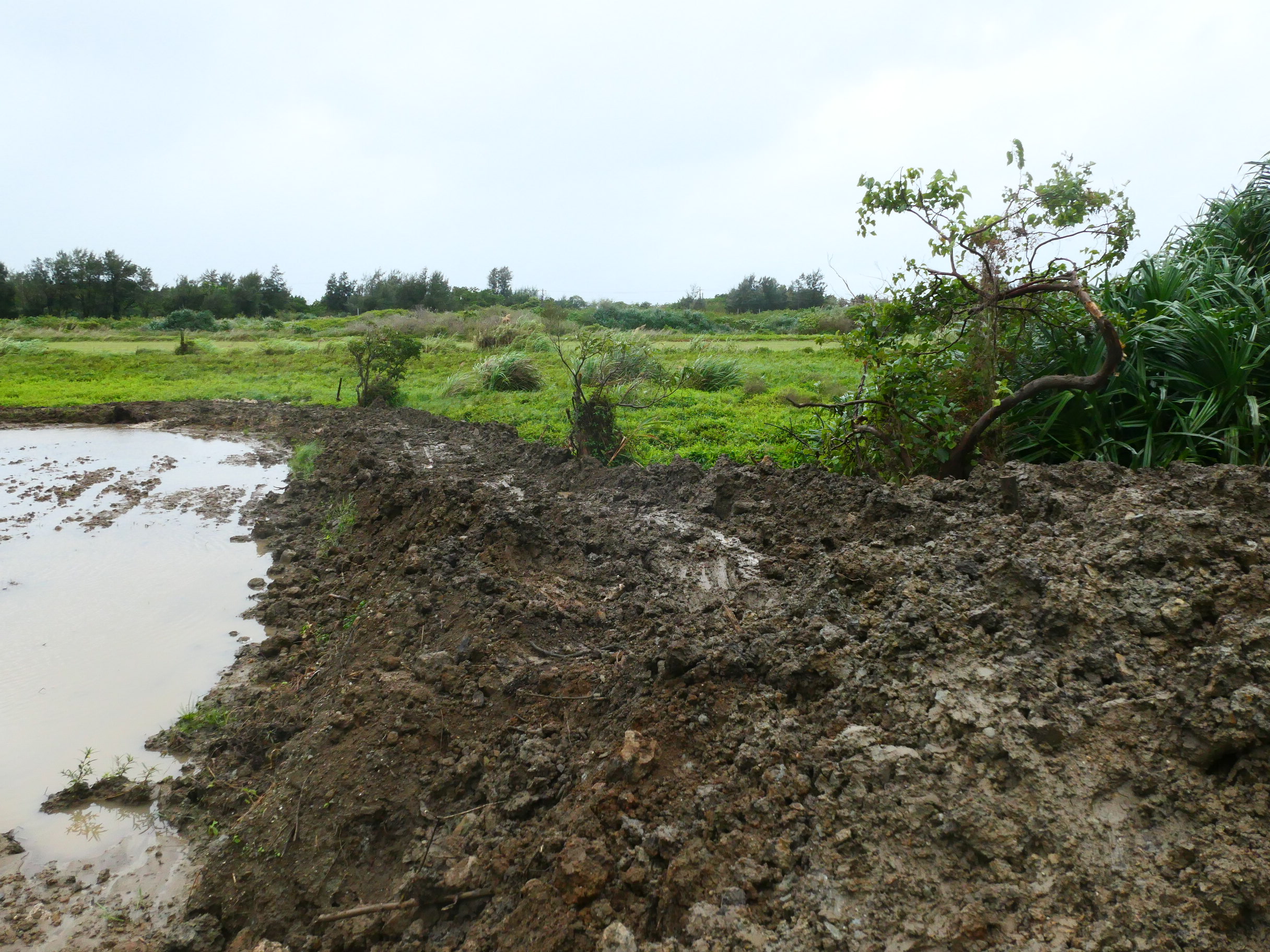 池を掘った土で丘を作る。丘にいたり湿地に行ったり、池に入ったりいろいろ出来れば水牛は楽しいだろう。草はいろいろ生えてはいるが、下の与那覇さんからお借りした3反には牧草はない。現在テツホシダが群生している。水牛は食べるのだろうか。どんな草にすれば良いのかも検討が必要になる。