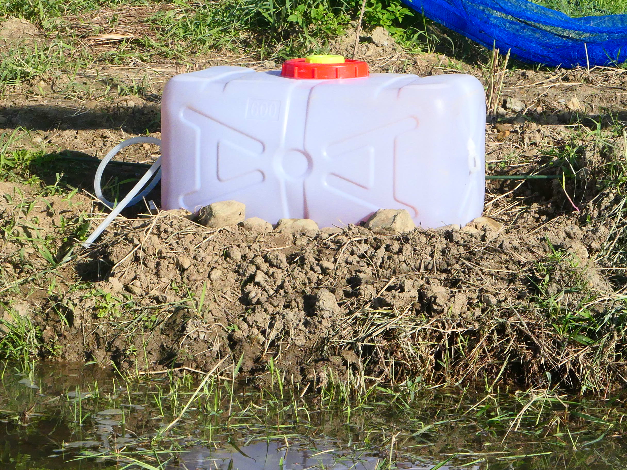 今回は200ℓタンクで田んぼの入水口の脇で培養し、入水に点滴で入れる計画である。点滴が終わったときに20ℓだけ残るように、バルブを調整した。そこにまた水とエビオスを入れて、培養をする計画。この繰り返しならば、10日毎に光合成細菌の投入が行えることになる。