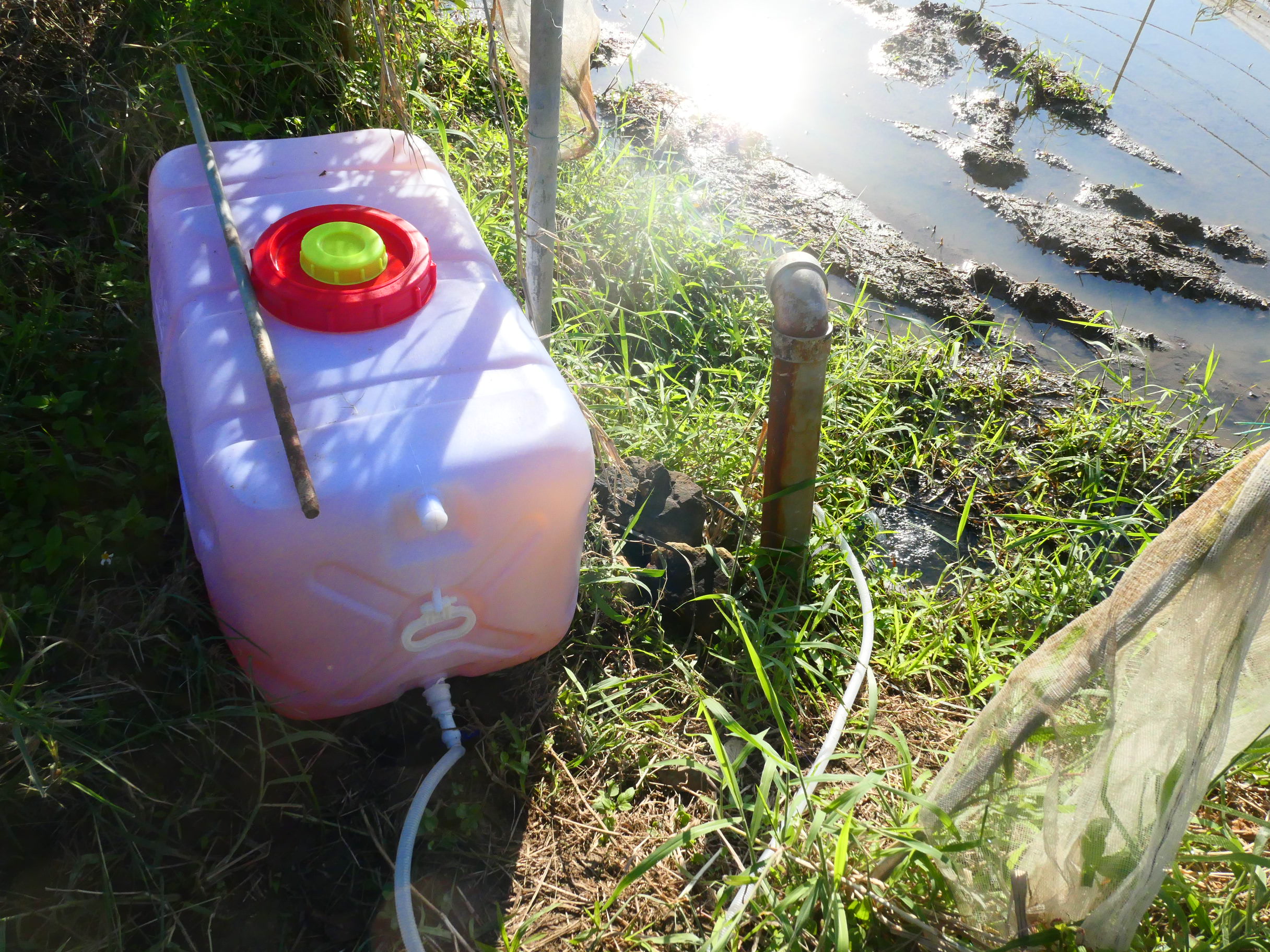 水はカルキ抜きなどしないでもそのままで大丈夫と言うことで、水道から500ℓのタンクにくんで、軽トラで田んぼ脇に置いてある、タンクまで運んでいる。できる限り簡単にやれるようにした。そうでなければ継続できないと思うからだ。継続が光合成細菌では意味があると考えている。