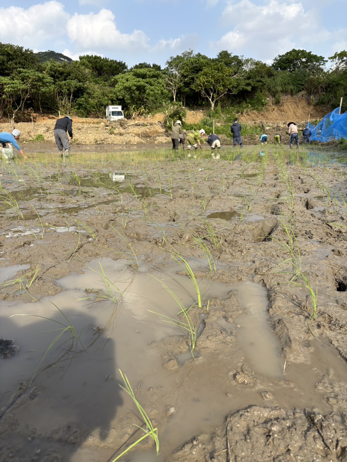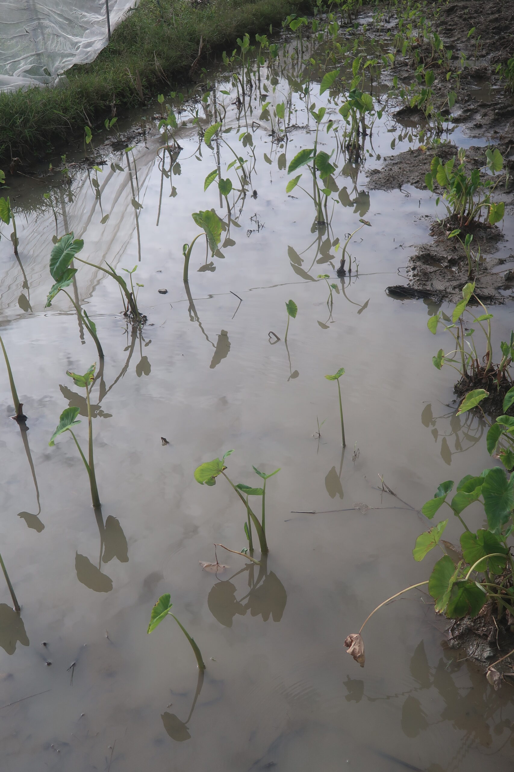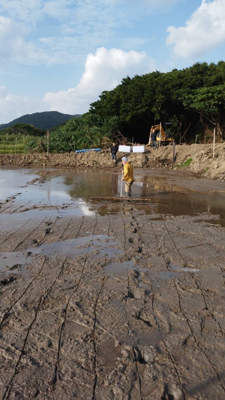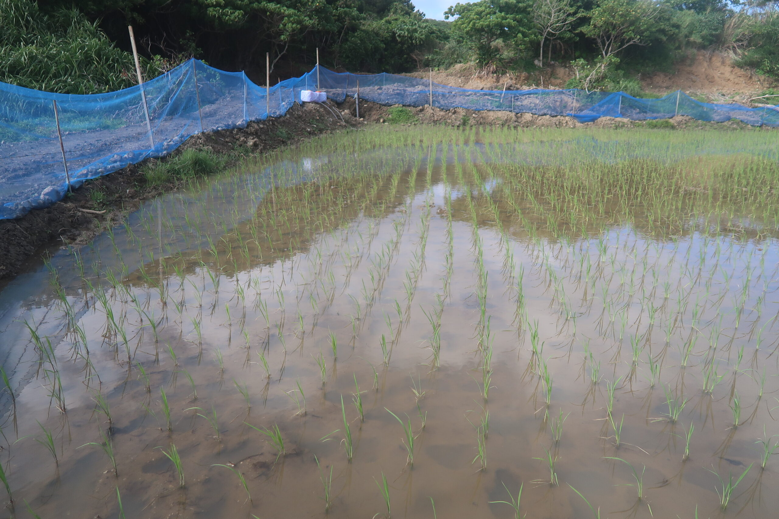 石垣島の田んぼでは一年中ジャンボタニシがいる。田んぼの縁には1月も卵が産み付けられているから、一年中が活動期である。しかし、田植後3週間特に被害はない。7葉期になれば、もうジャンボタニシの食害を気にする必要もないので、下の田んぼではそのまま様子を見ることにする。