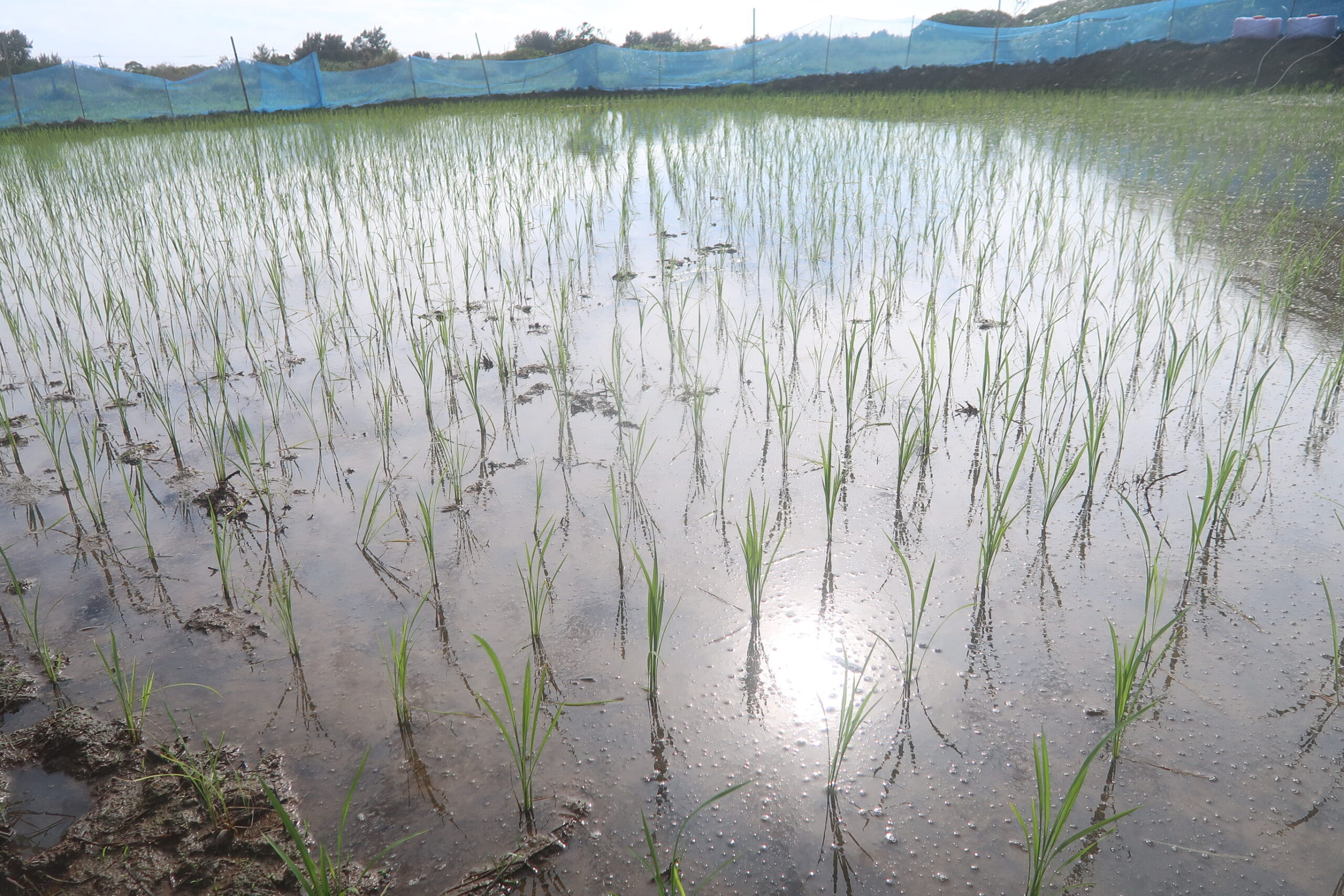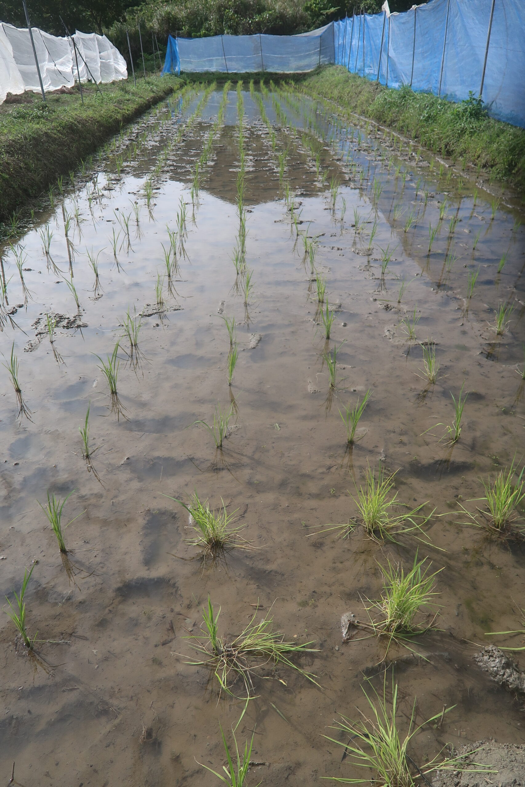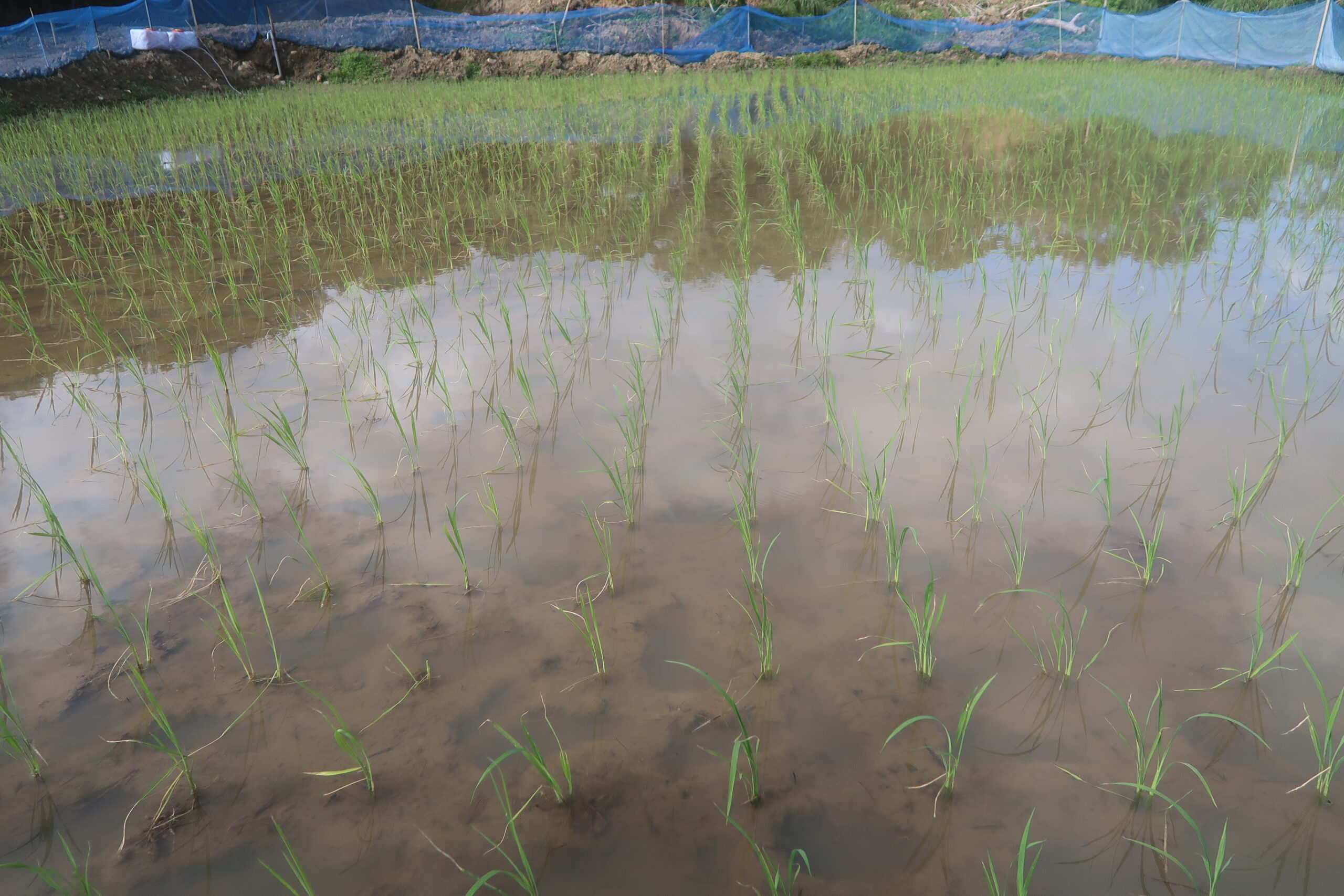 活着がいまいち良くなかったという印象はあるが、根付いて生育を始めて1枚から2枚良い葉が出たから、まずは一安心である。昨年はここでイネミズゾウムシが出たが、今年は今の所は出ていない。虫対策を考えて、今年は余り防風ネットで覆いすぎないようにしている。