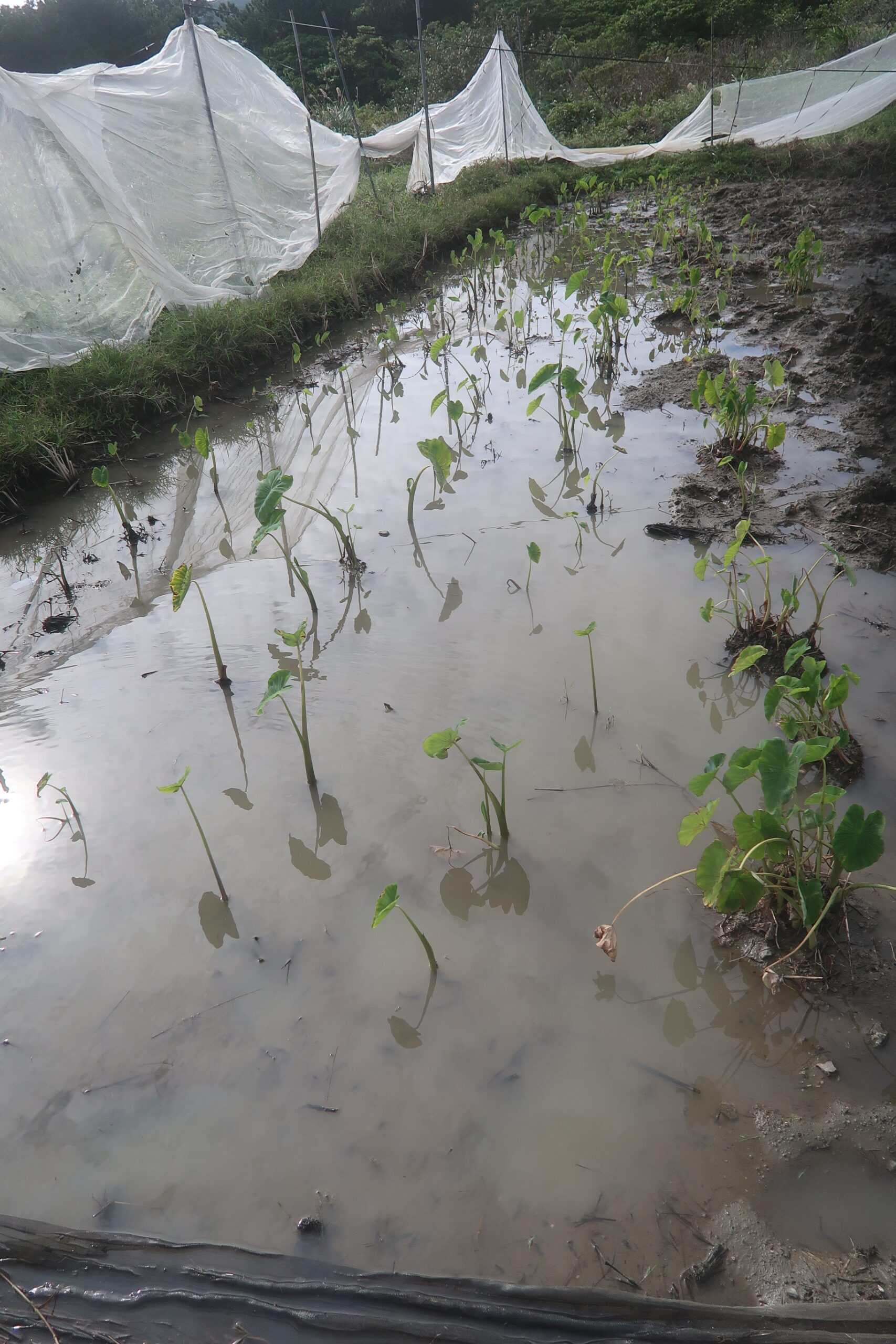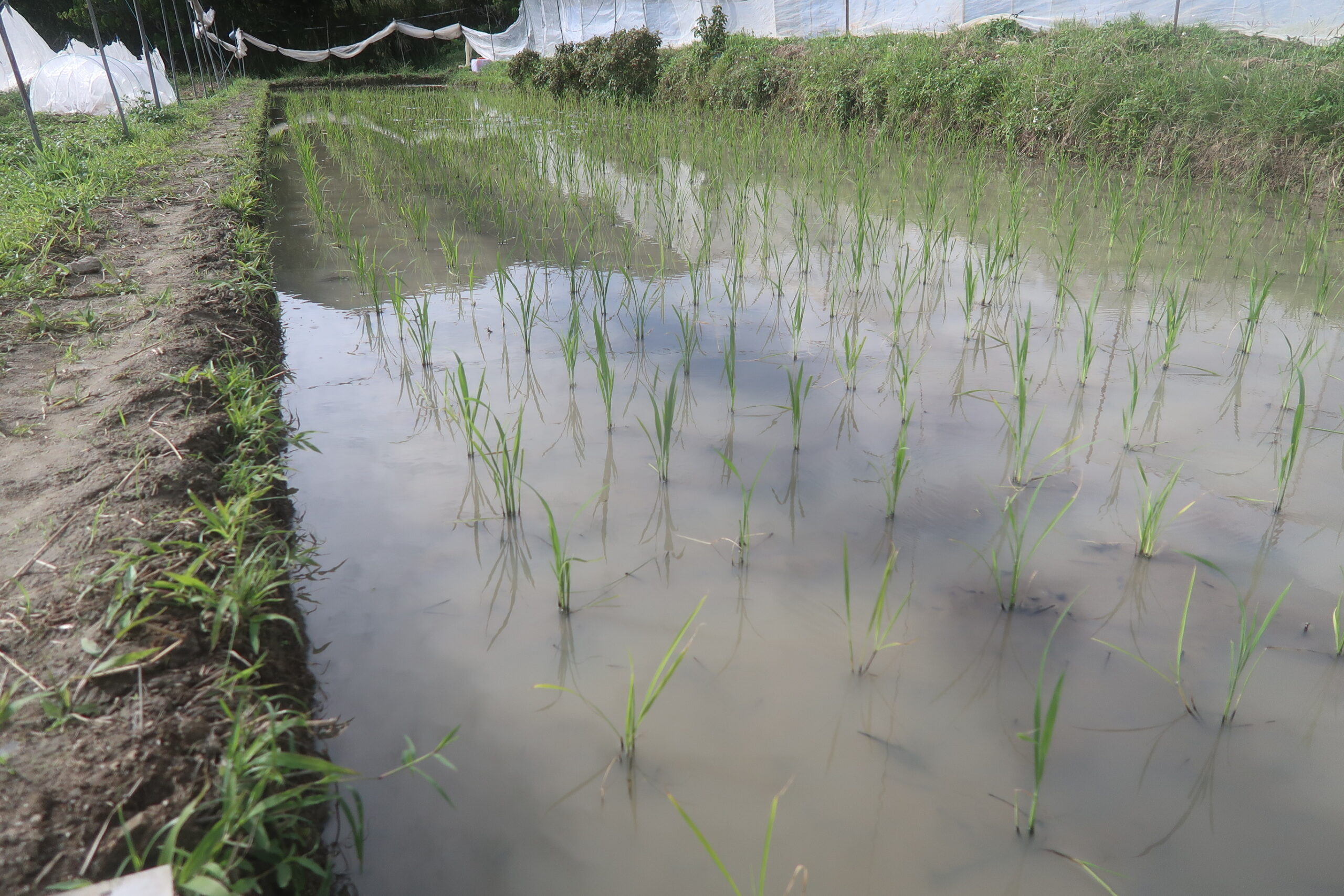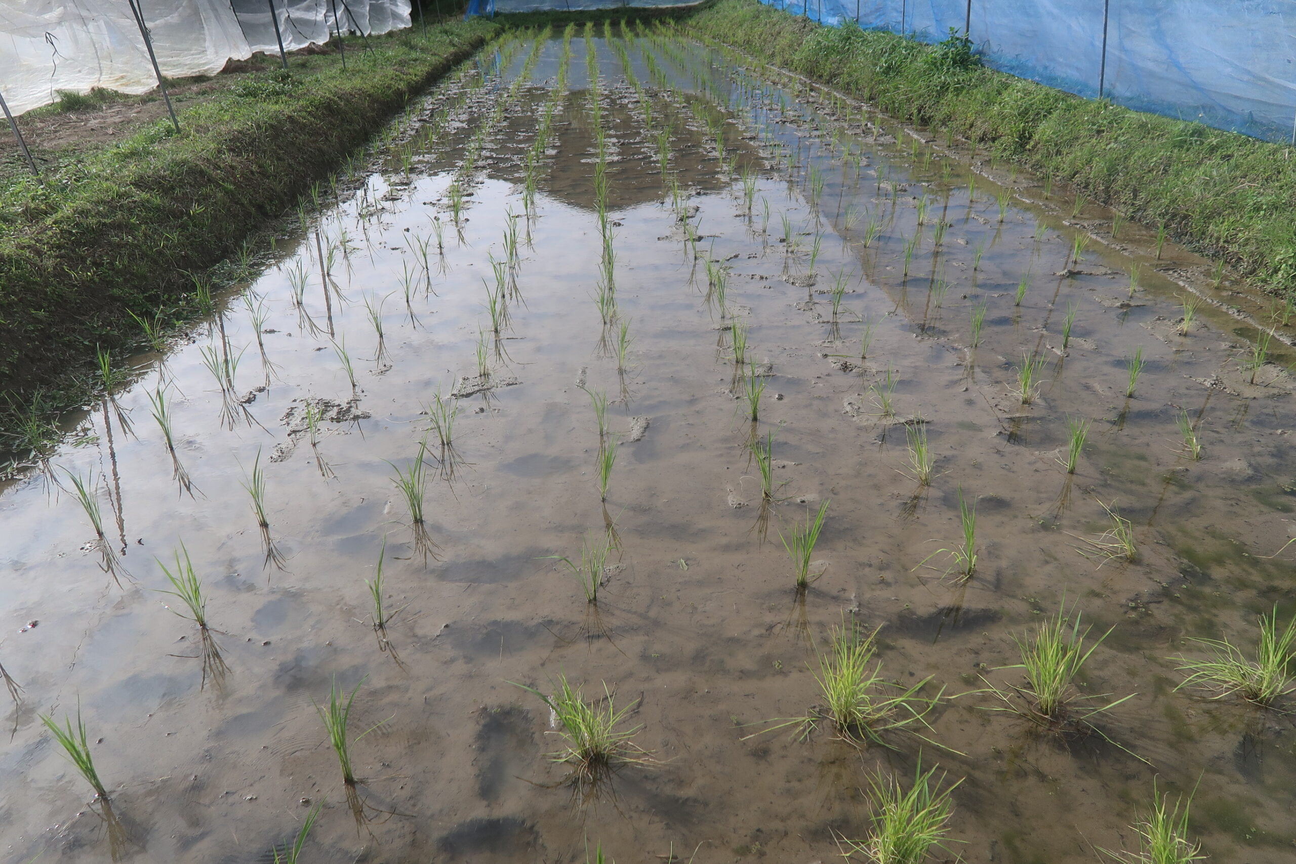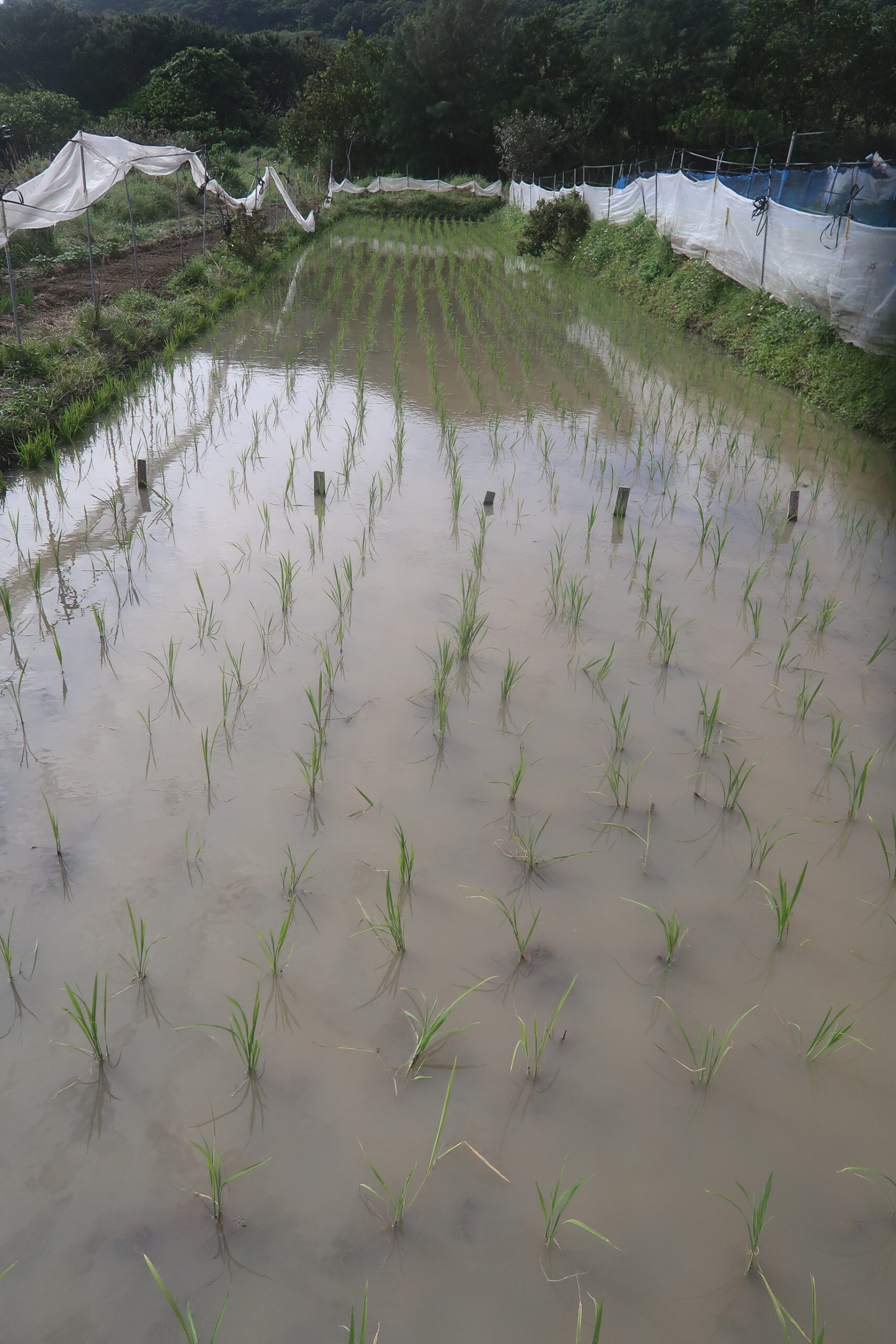 活着がいまいち良くなかったという印象はあるが、根付いて生育を始めて1枚から2枚良い葉が出たから、まずは一安心である。昨年はここでイネミズゾウムシが出たが、今年は今の所は出ていない。虫対策を考えて、今年は余り防風ネットで覆いすぎないようにしている。